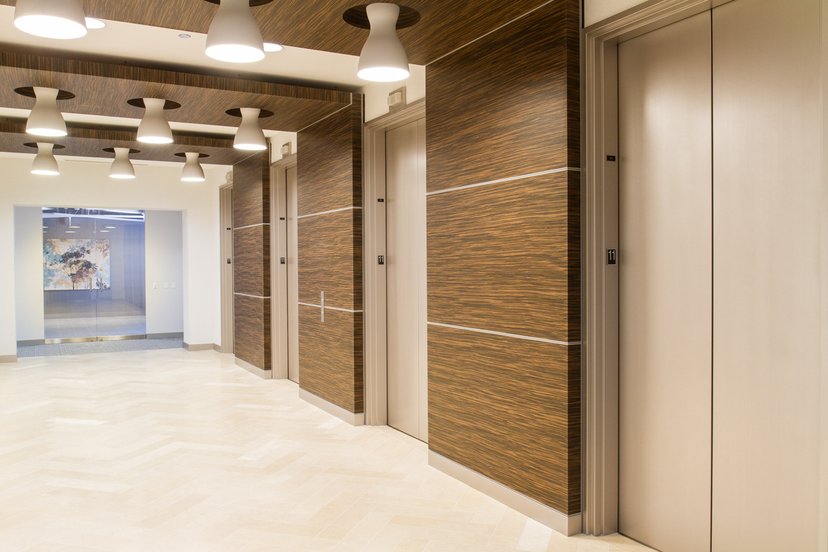 This elevator lobby was given a fresh new design that utilizes modern lines, bright lighting and rich, neutral finishes in order to appeal to existing tenants and attract a new generation of “young” companies.