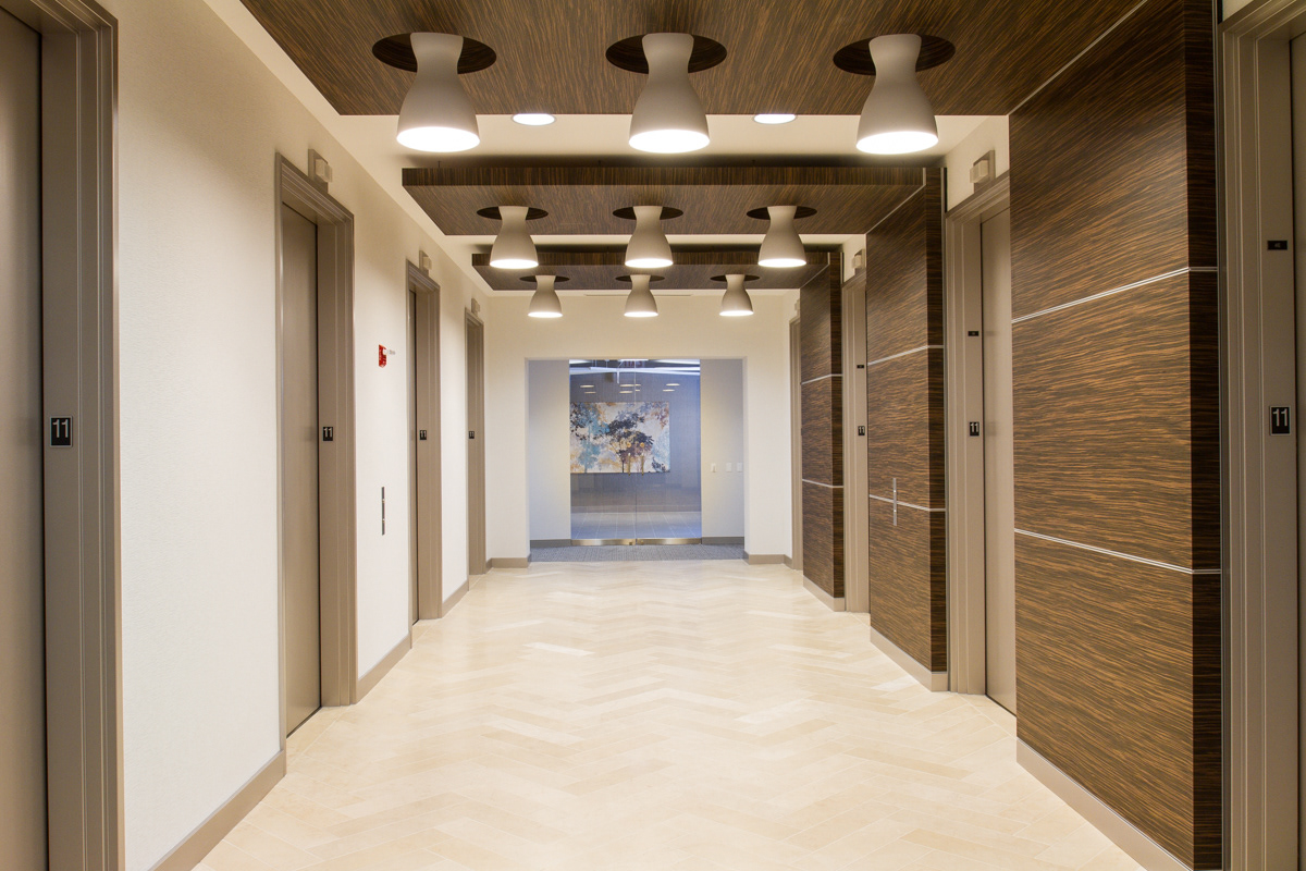 This elevator lobby was given a fresh new design that utilizes modern lines, bright lighting and rich, neutral finishes in order to appeal to existing tenants and attract a new generation of “young” companies.