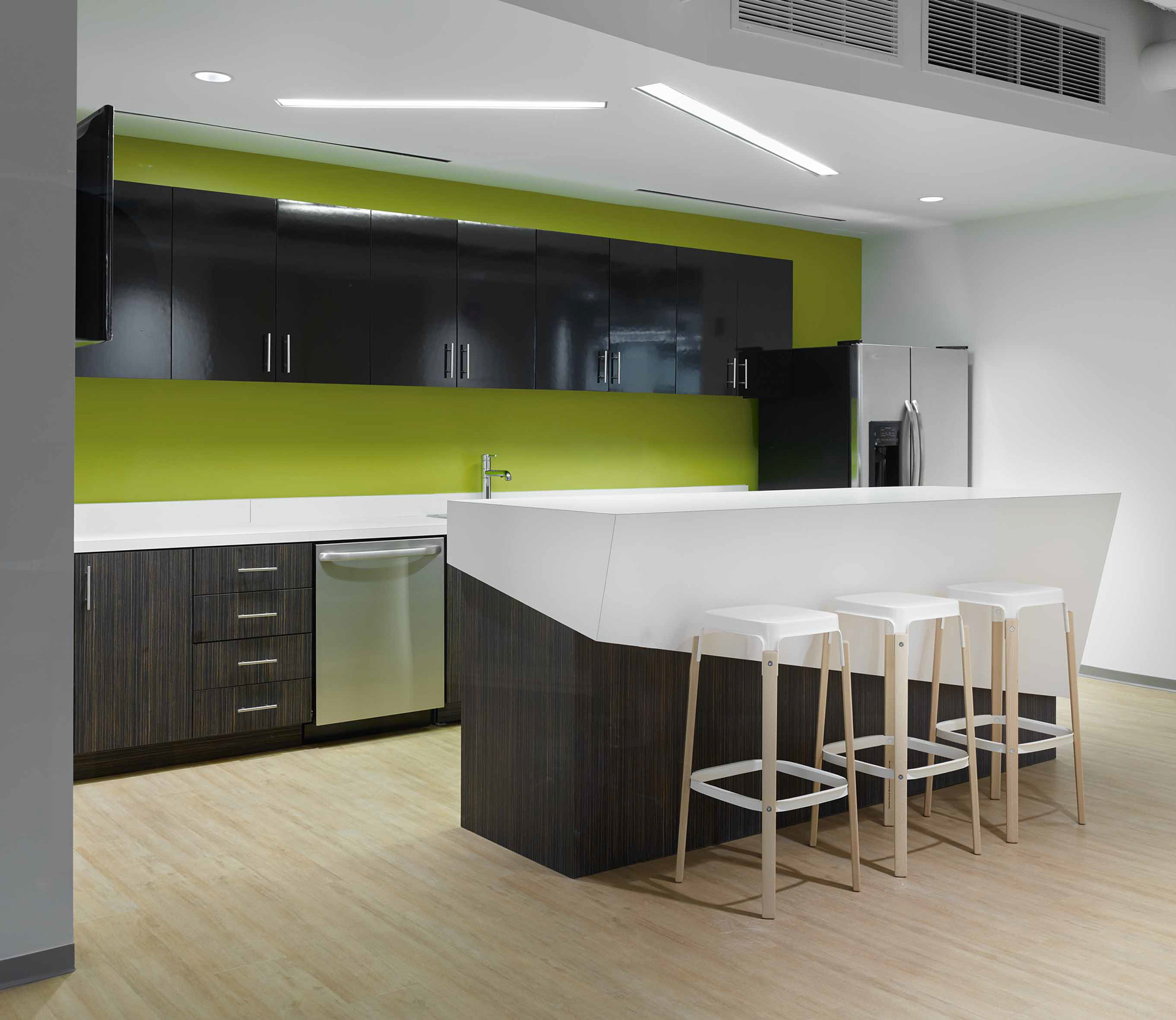 The existing architecture of the space brought a unique set of challenges to the project, which BOX Studios embraced in the new design. The uncommon triangular floorplan and angular bracing were emphasized through the placement of core spaces including the conference room and private offices at the center of the space. This located the walls of these core spaces parallel to the angled perimeter to accommodate standard benching furniture. In addition, the soffits, custom glazing and millwork all continue the angular elements throughout the details of the space.