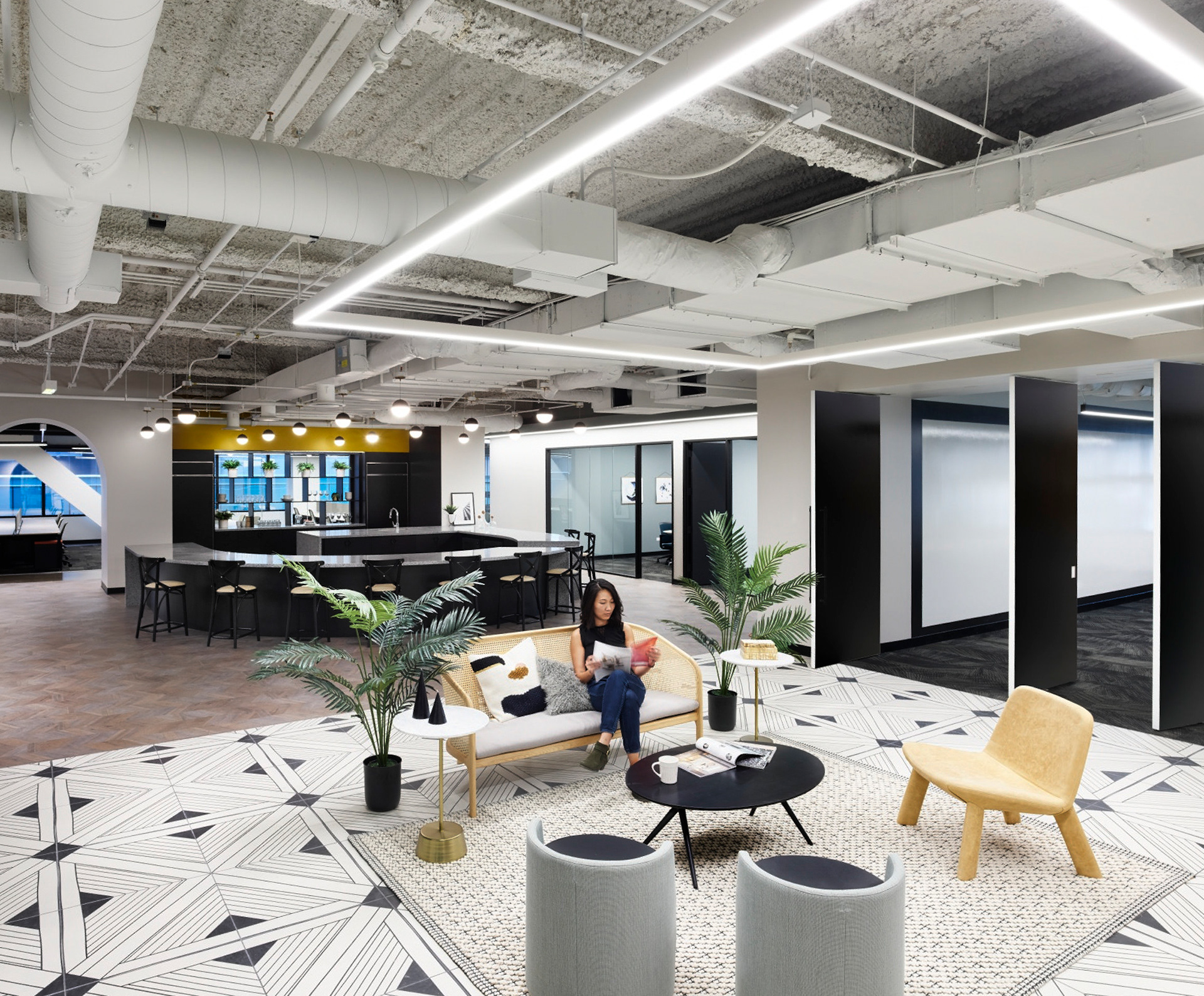 Tasked with giving life to a 20,000-square foot spec suite on 500 W. Madison's fifth floor, BOX Studios embraced the challenge with open arms, combining a bold bohemian aesthetic and innovative architectural elements to create a groundbreaking space that delights from every angle. Graphic ceramic floor tiles emulate a premium herringbone pattern from below, while striking ceiling graphics and light fixtures catch the eye from above. Curved archways and dual-sprayed ceiling finishes punctuate but never divide the office, which enriches its open office plan with a gorgeous outdoor cafe-style kitchen, an intimate coffee bar, and numerous distinctive phone, conference and multifunction rooms wherein to escape, collaborate and work remotely without ever leaving the office. All this flexibility makes for an endlessly moldable workplace for any company that literally and philosophically prefers not to sit still. BOX's marriage of complementary form and stunning visual language gives way to a one-of-a-kind environment that will delight tenants and guests alike — at first sight, and every day thereafter.
