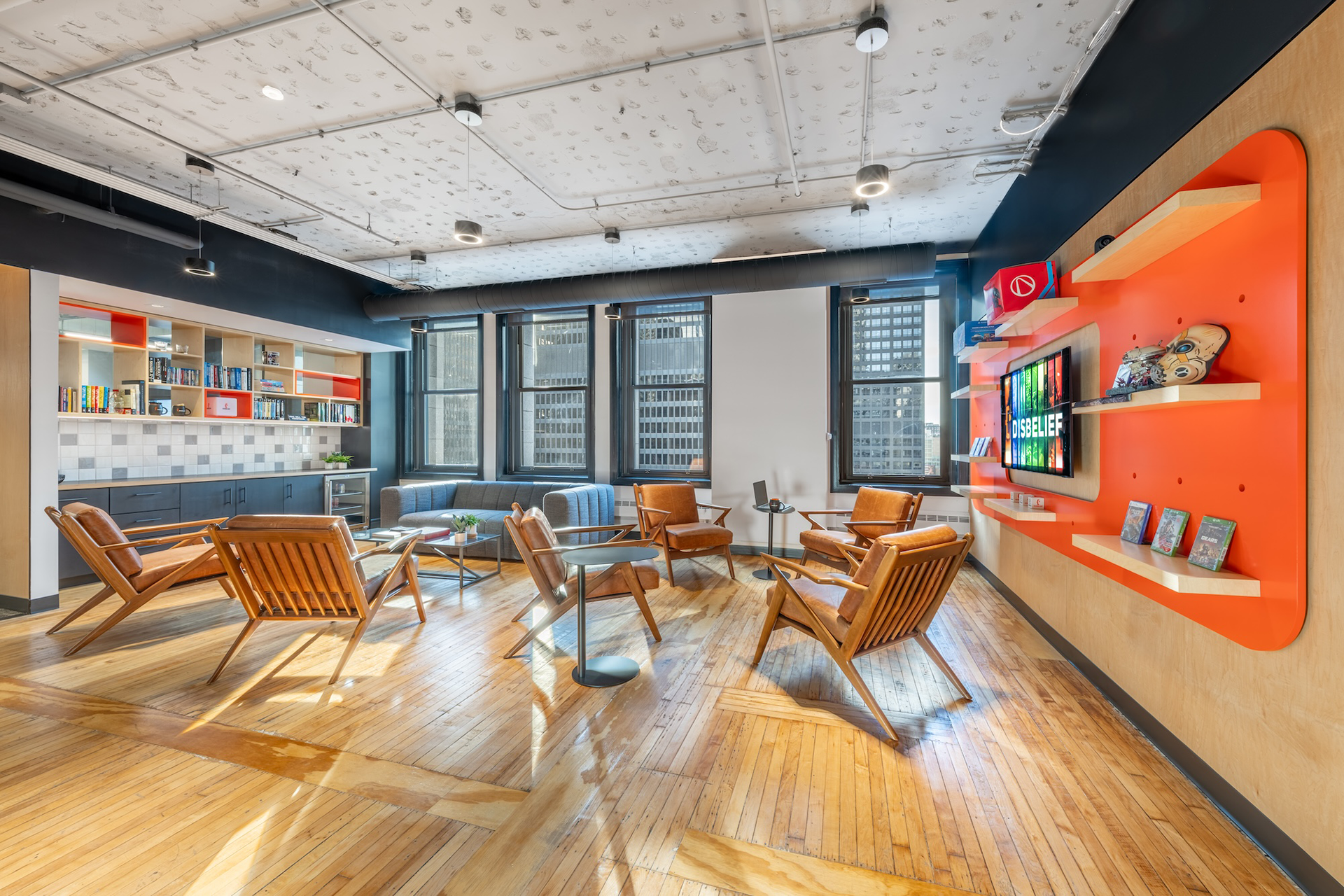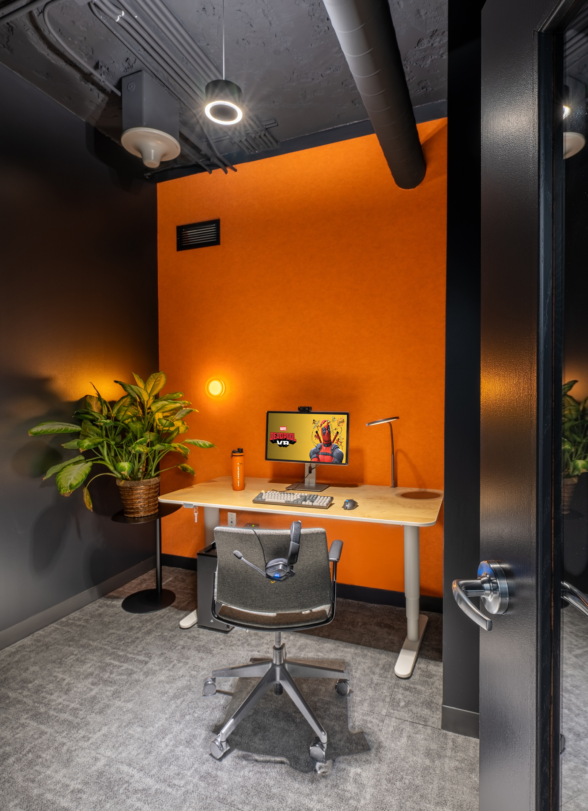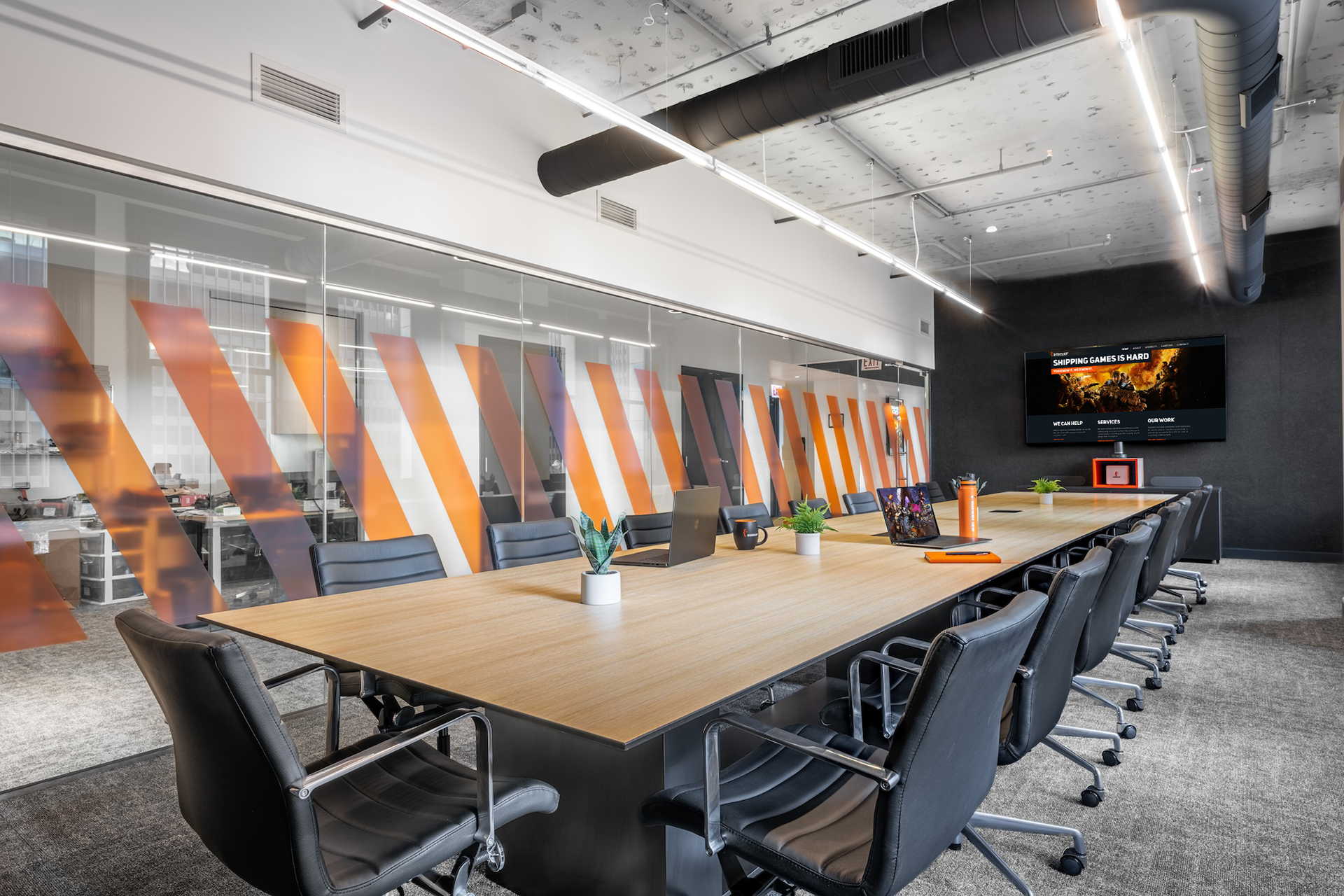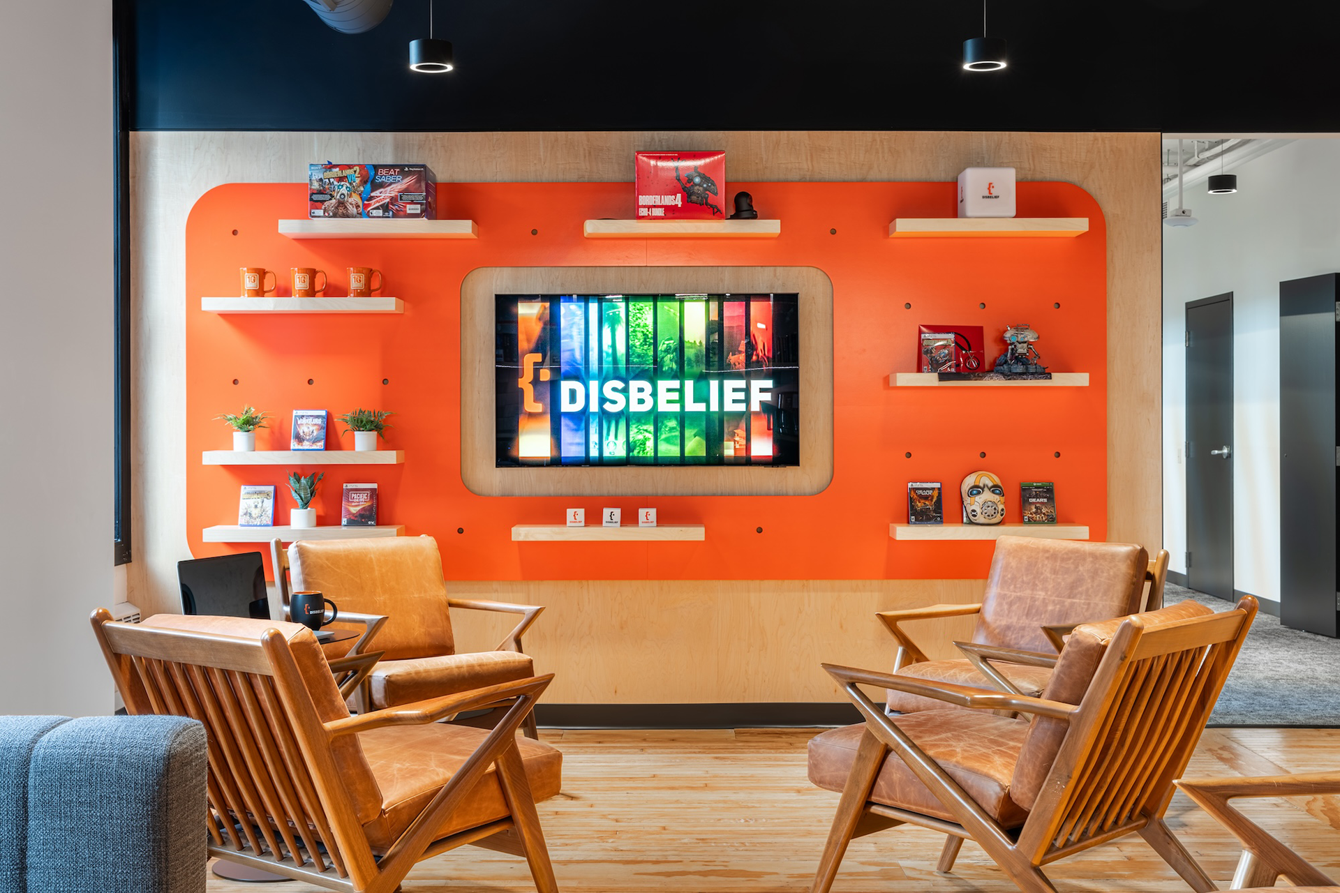 Designed with both function and identity in mind, the use of bold black and orange accents throughout is visually striking and reinforces the Disbelief Games brand. These color elements are thoughtfully integrated into furnishings, finishes, and lighting to energize the workplace while maintaining a professional and immersive environment. The result is a modern, adaptable office that enables Disbelief Games to continue contributing to the development of some of the industry’s most well-known video games, fostering creativity, focus, and teamwork in equal measure.