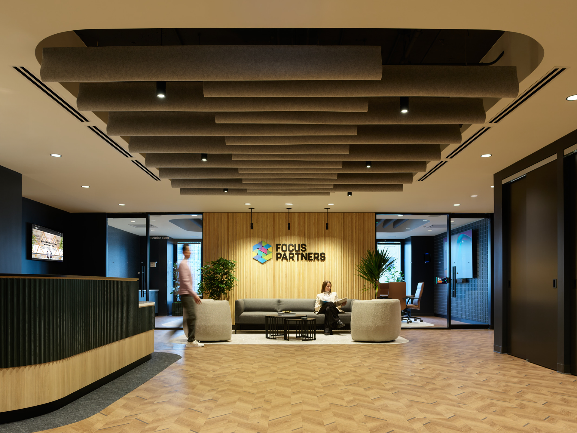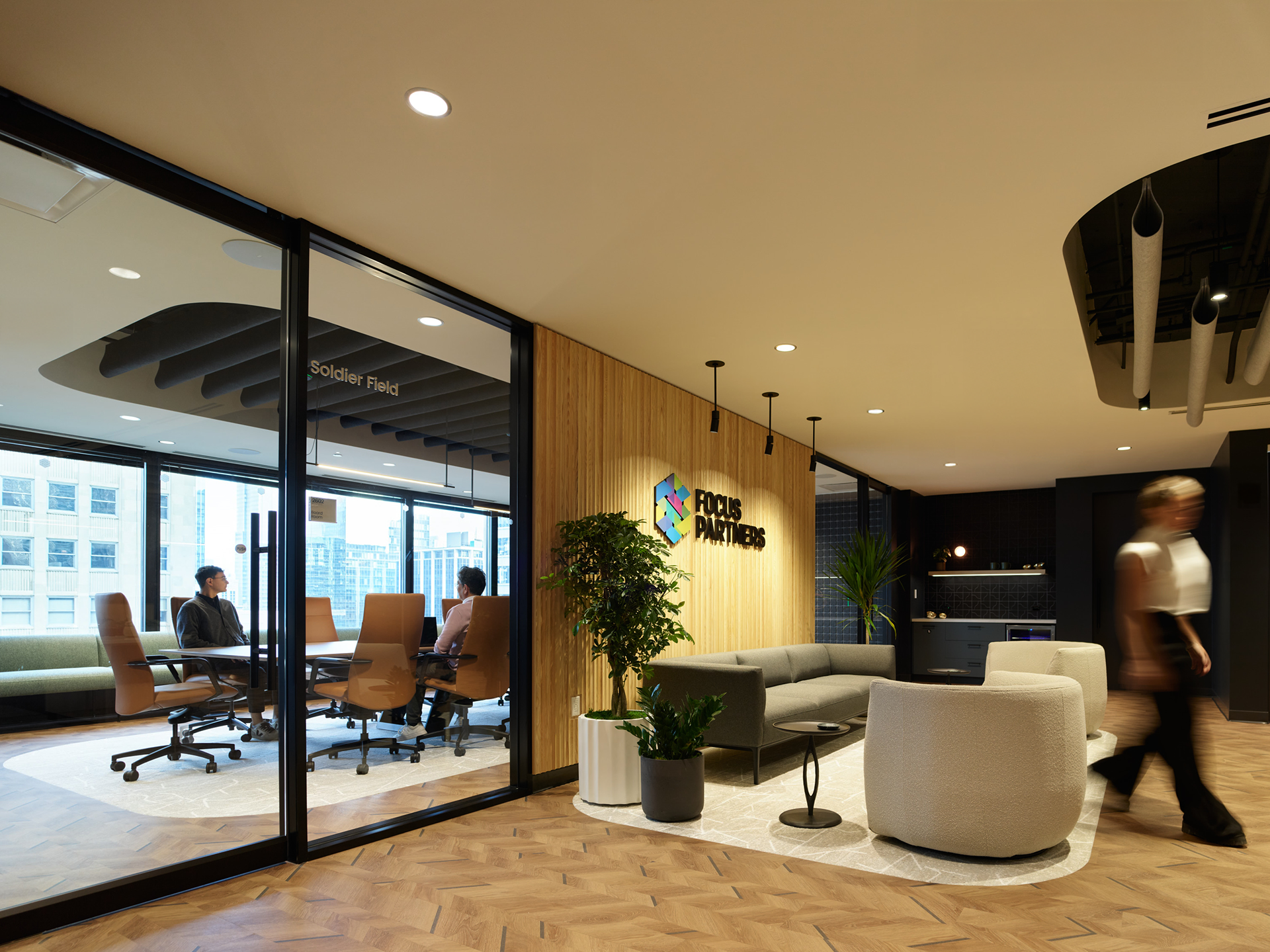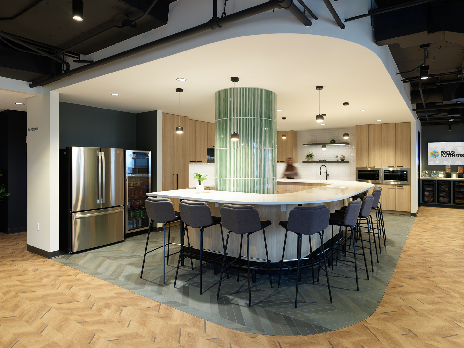 The result is a visually distinctive office that reflects Focus Partners’ professional identity and client-centric culture, while also providing an engaging destination that encourages return-to-office, strengthens collaboration, while in-turn positioning the firm for continued success.