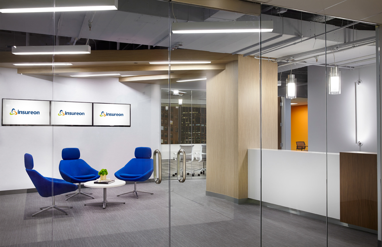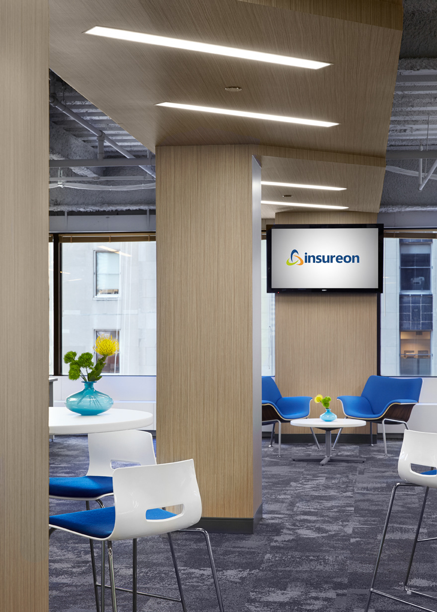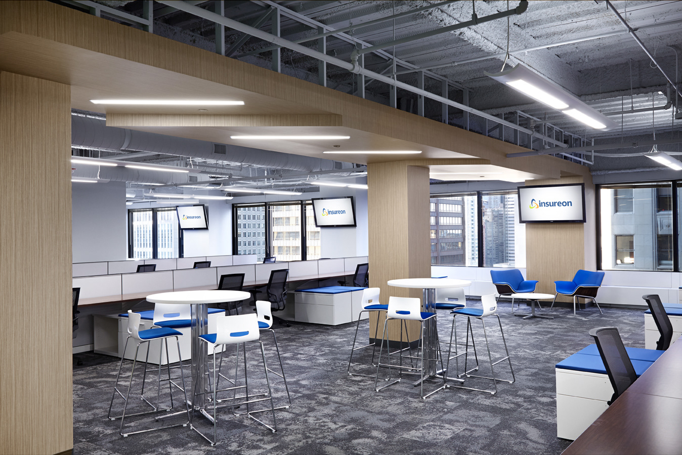 Internet-based business insurance provider, Insureon, scooped up this creative spec suite in the middle of construction. The aesthetics of an open plan, exposed ceilings and collaboration areas fit the company’s culture and help with recruiting and retention.