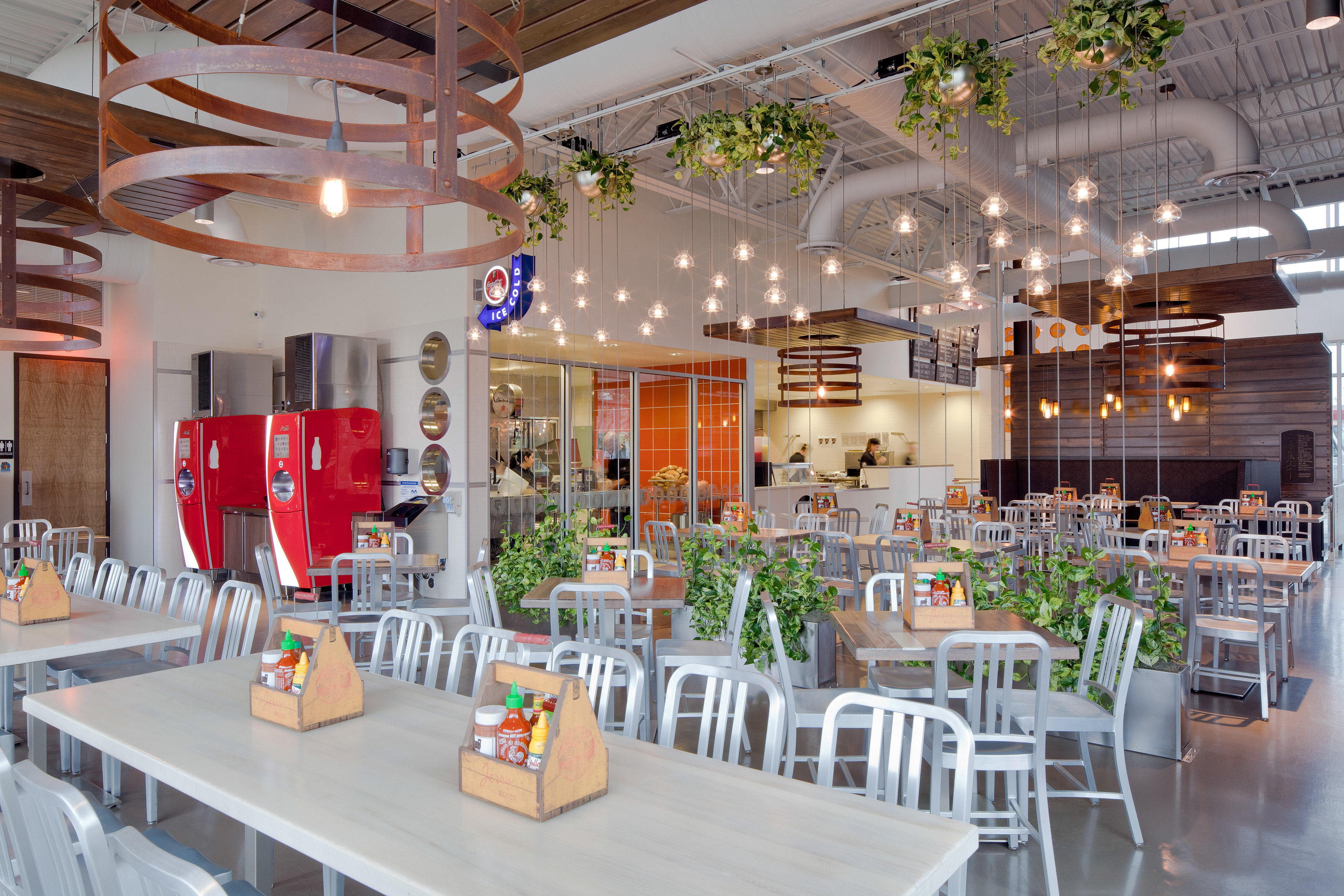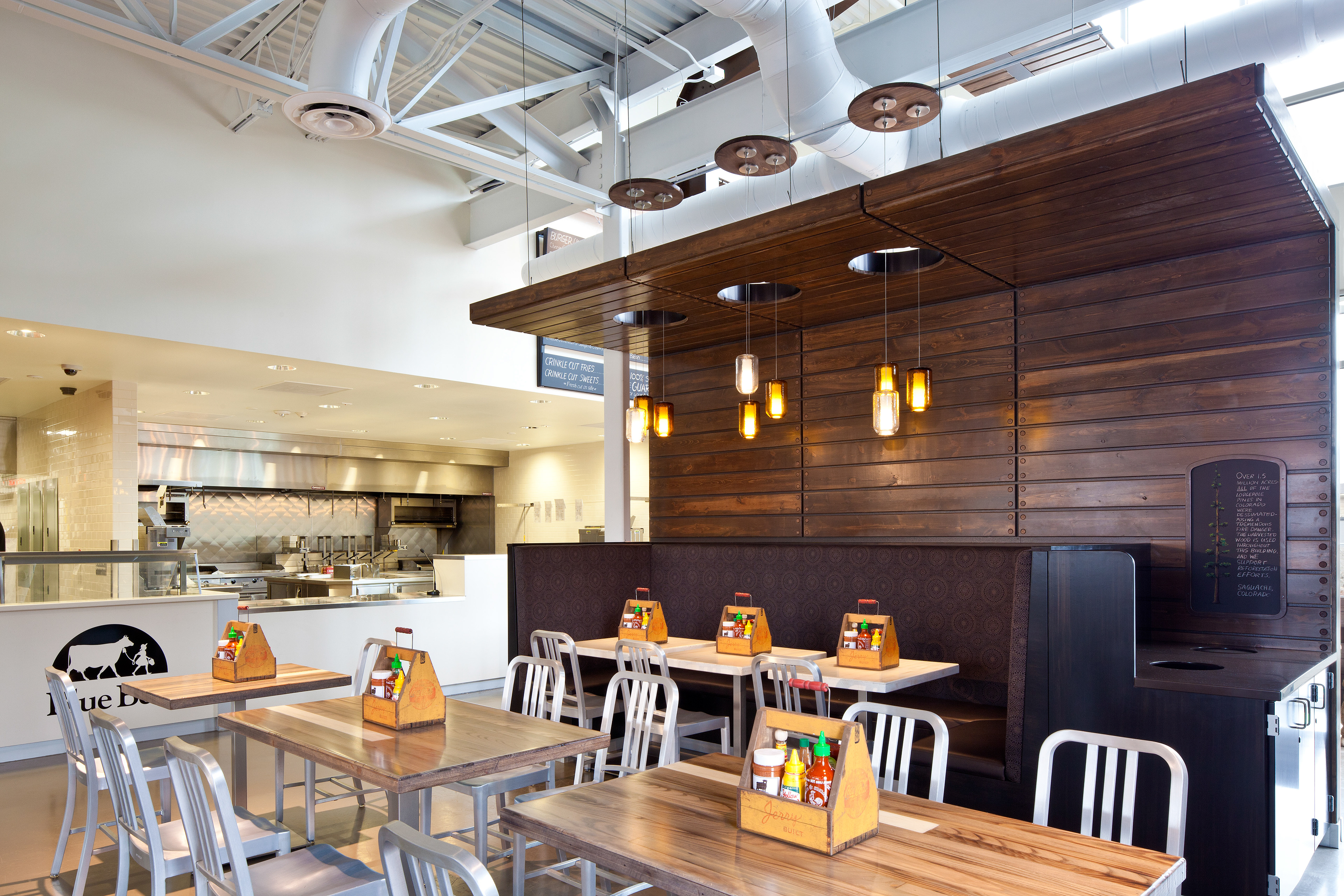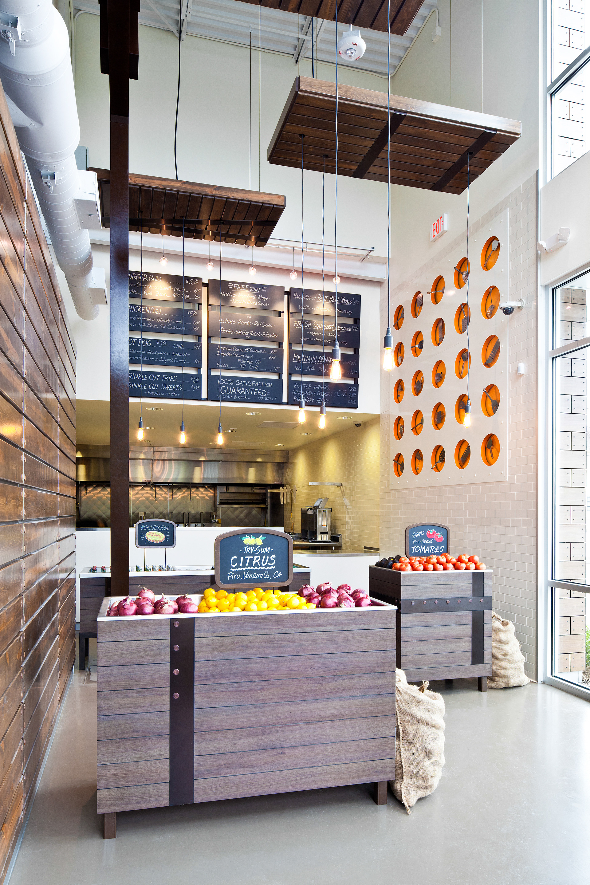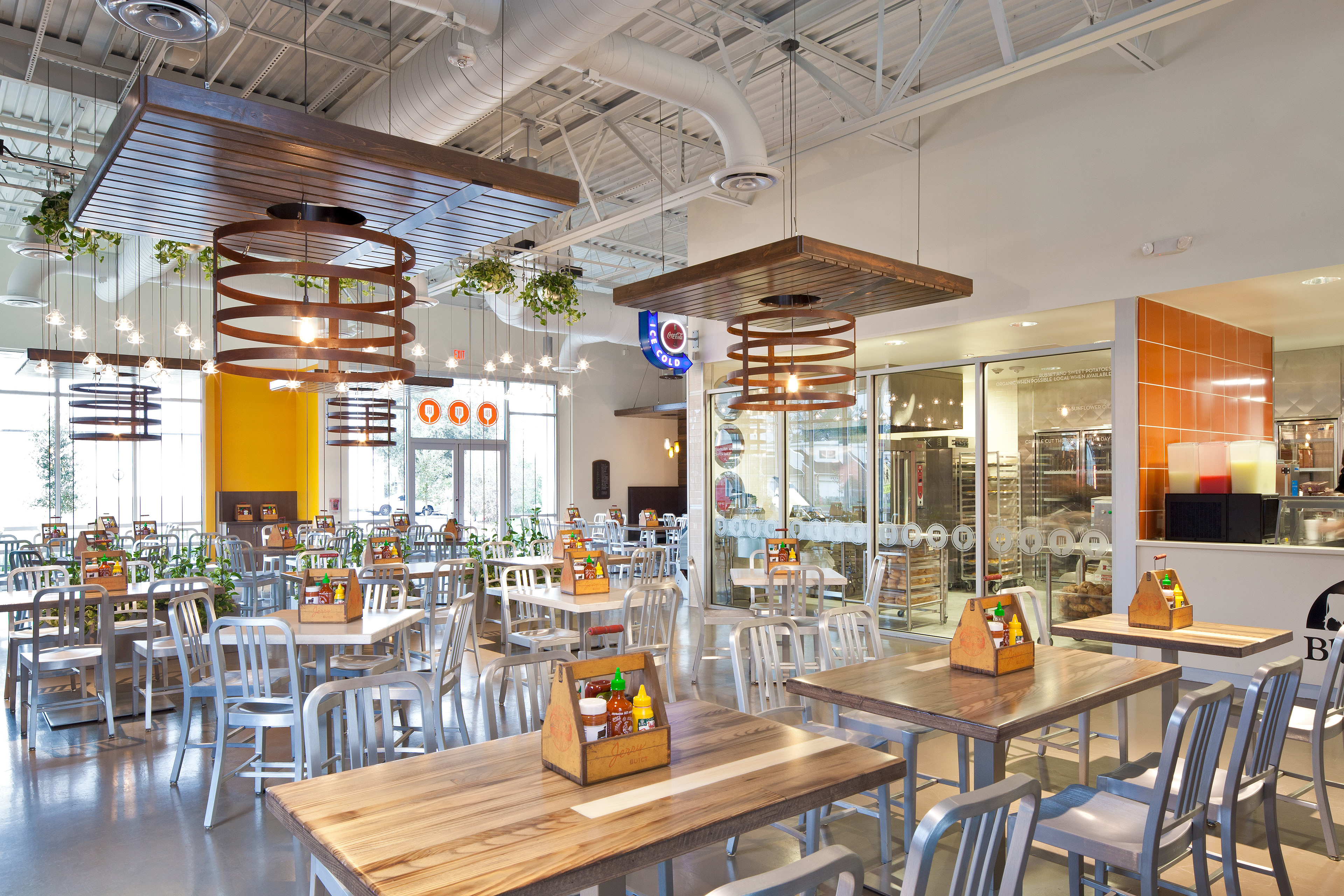 BOX Studios has created a design for our first JerryBuilt Homegrown Burgers that in many ways defines what we hope our customers regard as JerryBuilt: simple, functional, and delightful. Large and small artistic gestures adorn the seating areas. The chef’s tools of the trade―a comprehensive spatula collection―are reverently displayed in a backlit niche. Each restaurant will include a mural-sized collage of community images commissioned for that locale. The kitchen is fully in view from the seating area, for patrons to follow the preparation process.